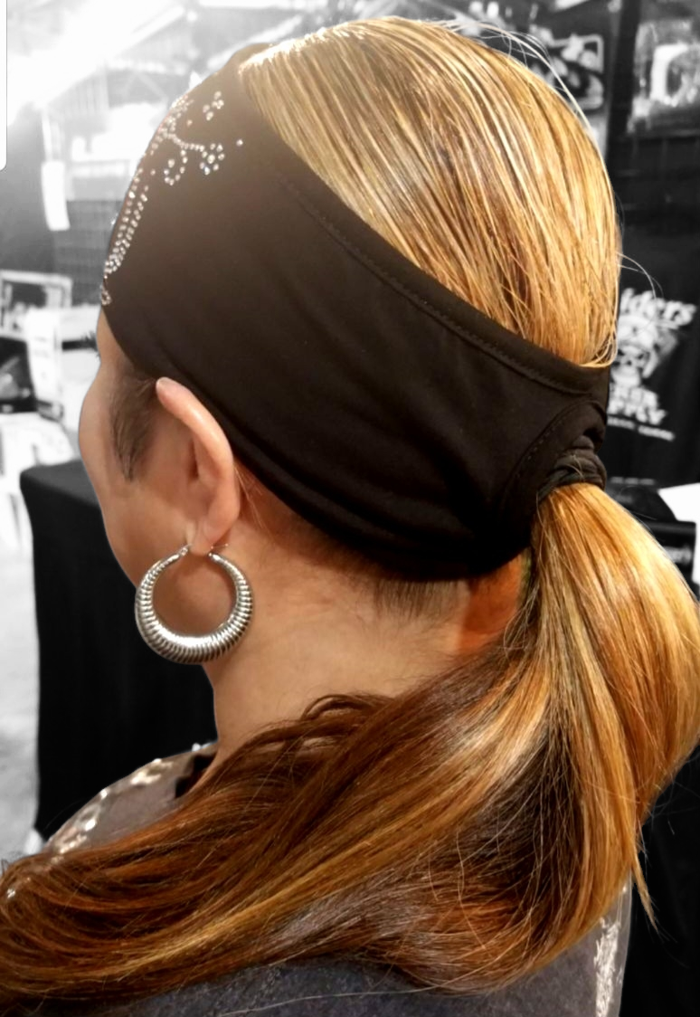 Polly Pony Headband The Ultimate Road Hair Accessory Product Description: A super soft polyester/spandex four inch wide headband with a hole in the back for a Ponytail. Product Features: - Decorated with Gemstones - Built in ponytail holder - Holds tight at high speeds - Super soft Polyester /Spandex blend - Ultra comfortable - Hand wash and set out to dry.